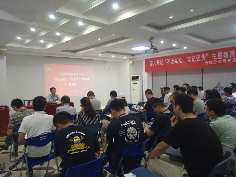 為深入開展“不忘初心,牢記使命”主題教育活動,將主題教育落到實處、產生實效,切實加強分公司黨員干部的責任感、使命感、擔當感,合肥分公司黨支部于7月17日下午在公司十五樓職工之家召開了“不忘初心,牢記使命”主題教育座談會,分公司領導班子成員、機關全體人員、在肥項目部人員共計40余人參與會議。會議由分公司黨支部書記胡迎東主持。
