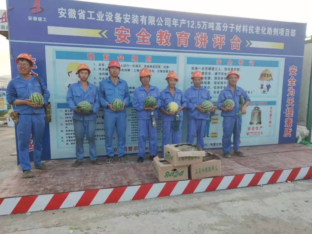 珠海連日高溫,氣候炎熱,為確保勞動者安全、健康生產工作,響應公司“送清涼”活動安排,利安?。ㄖ楹#┬虏牧嫌邢薰灸戤a12.5萬噸高分子材料抗老化助劑項目一期工程項目部積極開展了送清涼活動,為施工現場汗流浹背的工人們購買了西瓜、純凈水、藿香正氣水、人丹、十滴水等防暑降溫物品。