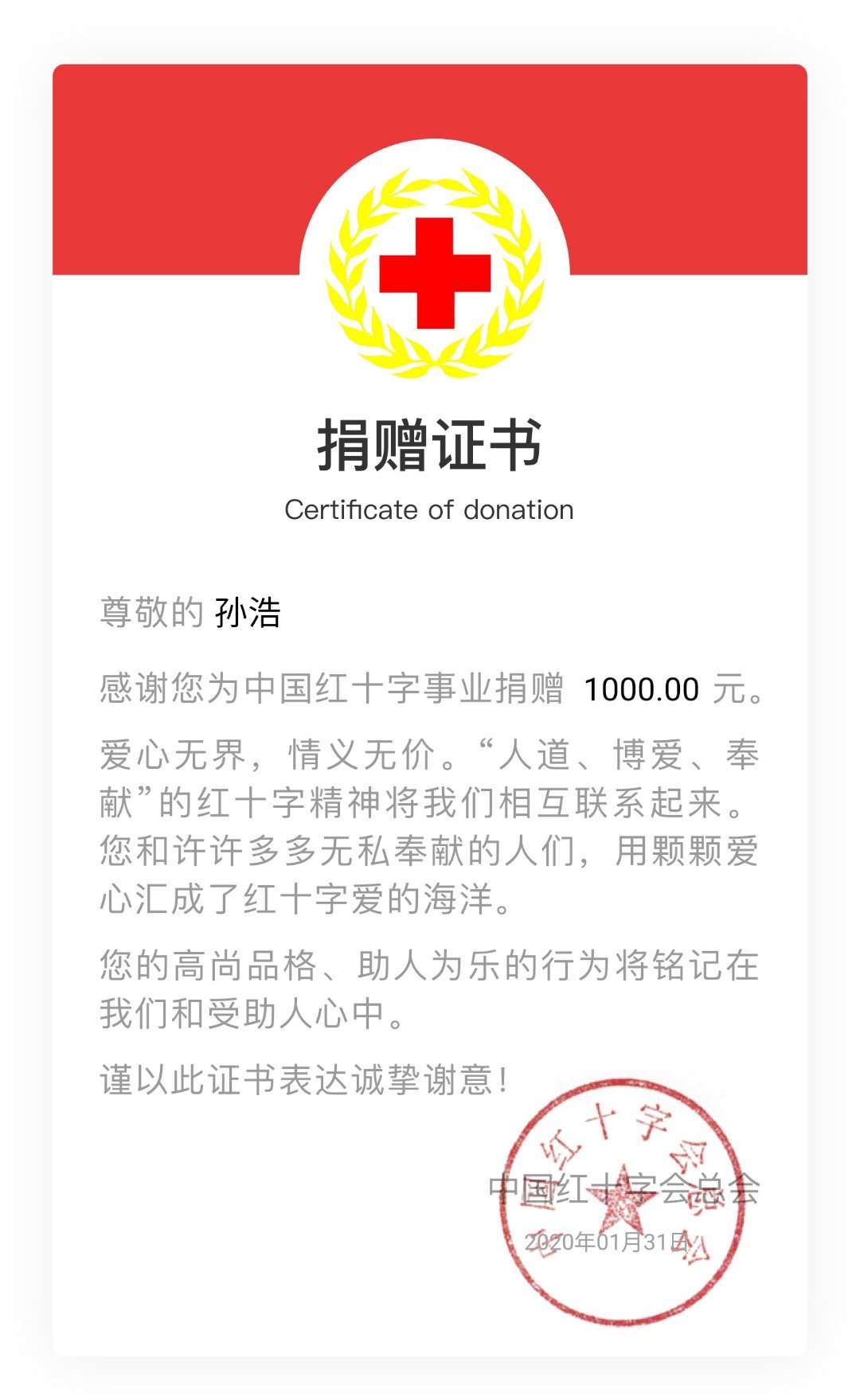 自新型冠狀病毒引發的肺炎疫情從湖北武漢爆發以來,始終牽動著眾人的心,更有不少愛心人士主動奉獻愛心。1月31日,孫浩一家三口懷著對武漢疫區同胞深深的愛,向中國紅十字會捐款抗擊疫情,以表達對武漢疫區人民的關愛。