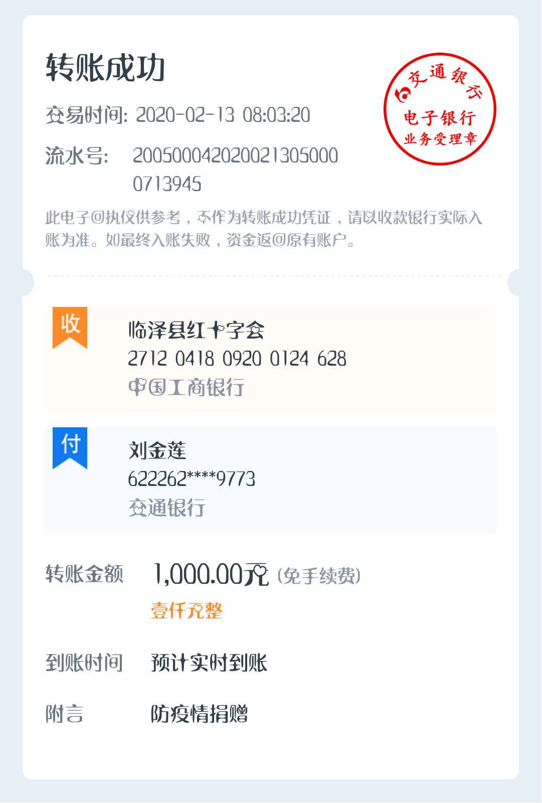 她就是寧夏辦事處職工劉金蓮?fù)尽⒔鹕復(fù)驹诠ぷ髦姓J(rèn)真積極,是一名陽(yáng)光樂(lè)觀、任勞任怨的優(yōu)秀員工,她在平時(shí)生活工作中也總是積極主動(dòng)的幫助他人。在這次疫情爆發(fā)后,2月13日,劉金蓮?fù)局鲃?dòng)聯(lián)系當(dāng)?shù)馗拭C省臨澤縣紅十字會(huì),通過(guò)線上微信轉(zhuǎn)賬的方式,轉(zhuǎn)給紅十字會(huì)捐款人民幣1000元。接下來(lái),她又主動(dòng)聯(lián)系當(dāng)?shù)丶t十字會(huì)工作人員,要求主動(dòng)擔(dān)當(dāng)志愿者,但是因?yàn)榭陀^原因,沒(méi)有被批準(zhǔn)。