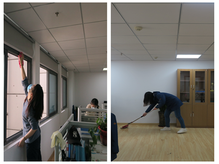 風(fēng)和日麗,大家早早的來到辦公室,三五一組,相互配合,擼起袖子加油干。開窗通風(fēng)、地面清掃、消毒殺菌、門窗擦拭、書柜整理、綠植澆灌、垃圾傾倒……大家熱情高漲、干勁十足,仔仔細(xì)細(xì)清理著每個角落,不遺漏任何一個死角。經(jīng)過半個多小時的辛勤勞動,辦公區(qū)域頓時變得更加清新明亮、干凈整潔,不由得令人耳目一新、賞心悅目。隨后,分公司文明衛(wèi)生檢查組還對各部門的衛(wèi)生情況進行了嚴(yán)格打分,并對檢查結(jié)果進行了通報。