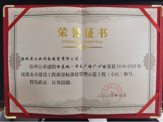 近日,安徽安裝公司承建的淮北恒基城開元廣場(chǎng)項(xiàng)目工程榮獲“2018--2019年度淮北市建設(shè)工程質(zhì)量標(biāo)準(zhǔn)化管理示范工程(小區(qū))”稱號(hào)。