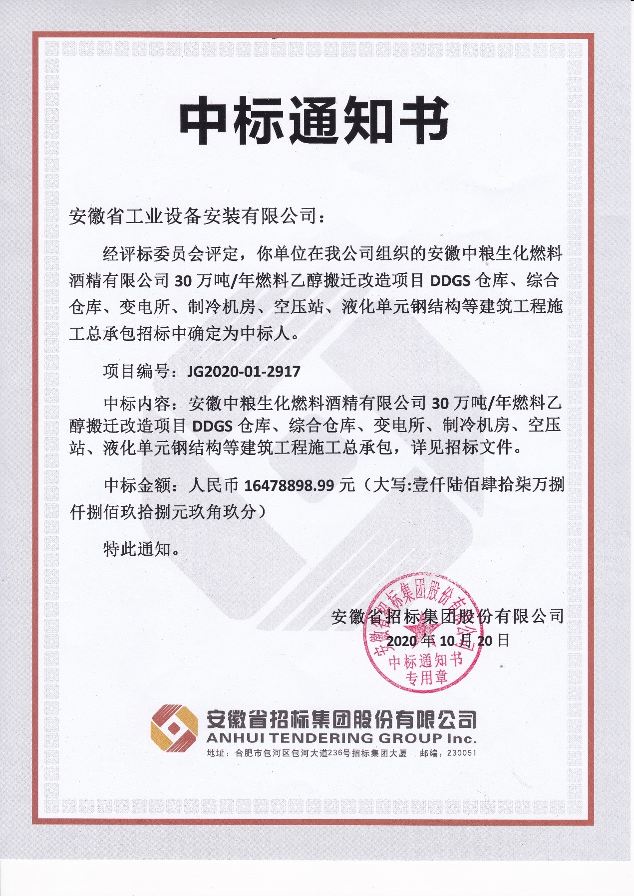 近日,蚌埠分公司經過激烈競標,成功中標安徽中糧生化燃料酒精有限公司30萬噸/年燃料乙醇搬遷改造項目DDGS倉庫、綜合倉庫、變電所、制冷機房、空壓站、液化單元鋼結構等建筑工程施工總承包項目,中標金額:1647.89萬元。過硬的資質、雄厚的技術實力、合理的價格、誠實守信的經營方式、完善的服務體系是我們勝出的理由。