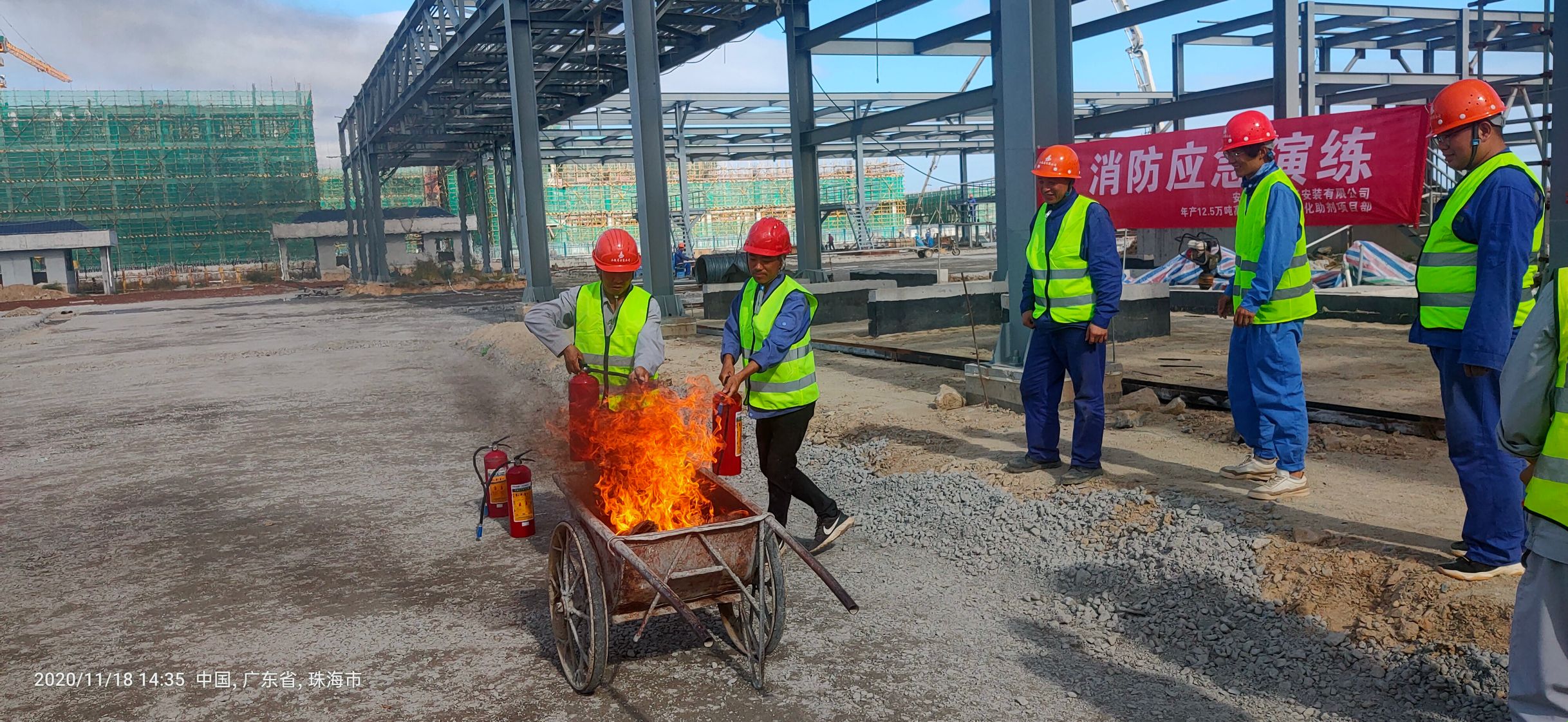 項目安全部負責人皮軍首先介紹了此次應急演練活動開展的相關要求及具體流程,重點對于滅火器材的原理、基本使用方法及相關注意事項進行了說明并親自進行了現場滅火示范操作。通過現場演練,皮軍進一步要求:一是項目部全員要提高思想認識,提高安全防御措施,把“安全責任重于泰山”牢記于心,對于所有動火區(qū)域操作按照規(guī)范進行。二是要及時進行危險源檢查、辨識、監(jiān)控工作,夯實各項安全生產,做到安全隱患及時排查與監(jiān)督。三是項目部要按照“預防為主、防消結合”的方針,加強安全生產法律法規(guī)及勞動安全知識的學習,提高應對突發(fā)事件的能力。
