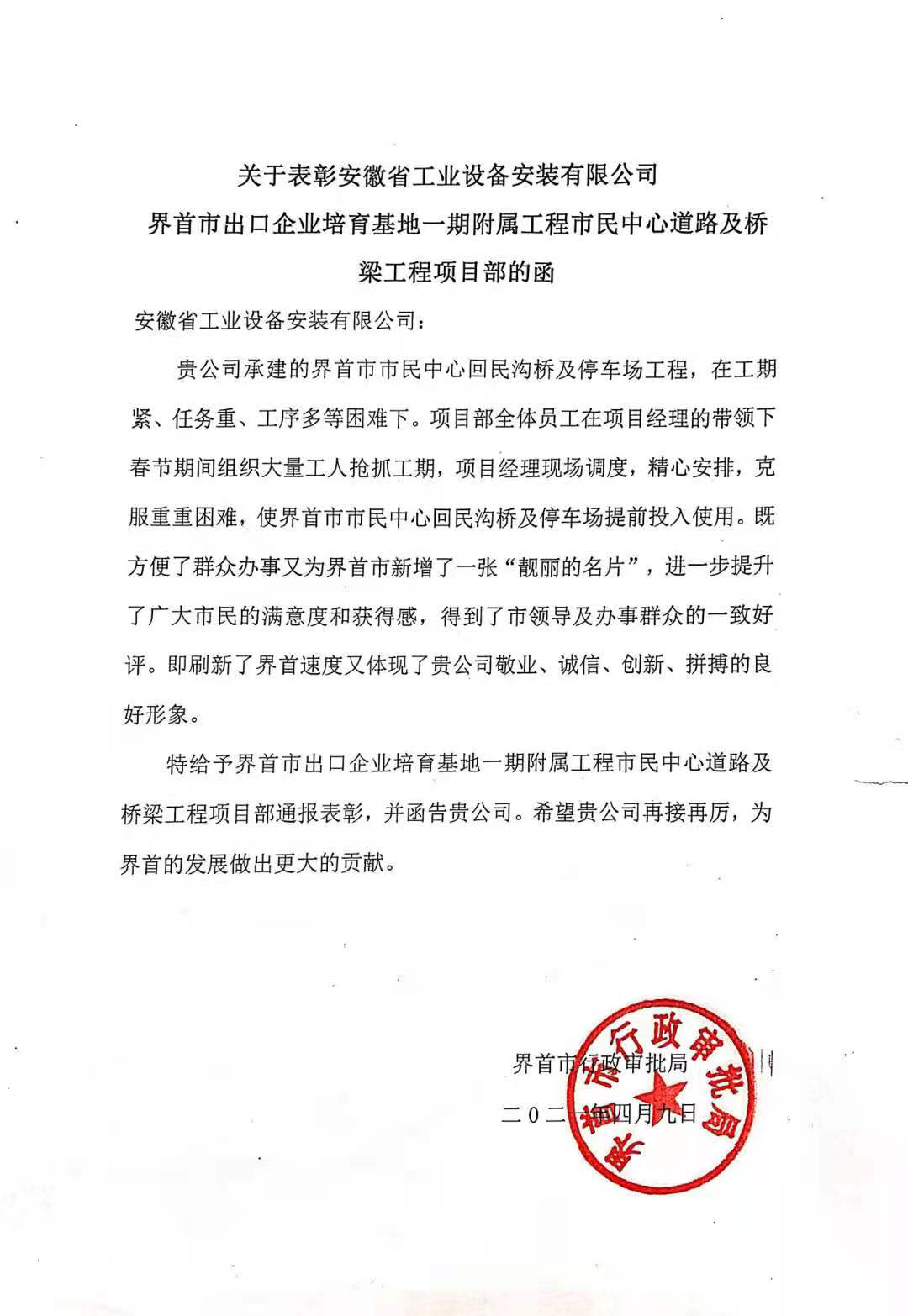 為此,界首市行政審批局發來表彰函,表彰界首市出口企業培育基地一期附屬工程市民中心道路及橋梁工程項目部在工程任務中的優秀表現,相信項目部全體人員會一如既往秉持“團結、拼搏、求實、創新”的企業精神,繼續努力,為城市的建設、企業的發展作出更大的貢獻!