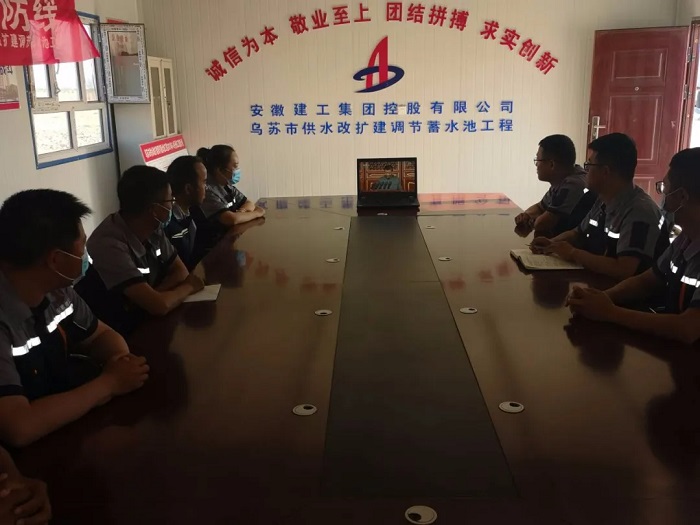 新疆烏蘇分公司烏蘇市供水改擴(kuò)建調(diào)節(jié)蓄水池項(xiàng)目部人員集中觀看大會直播