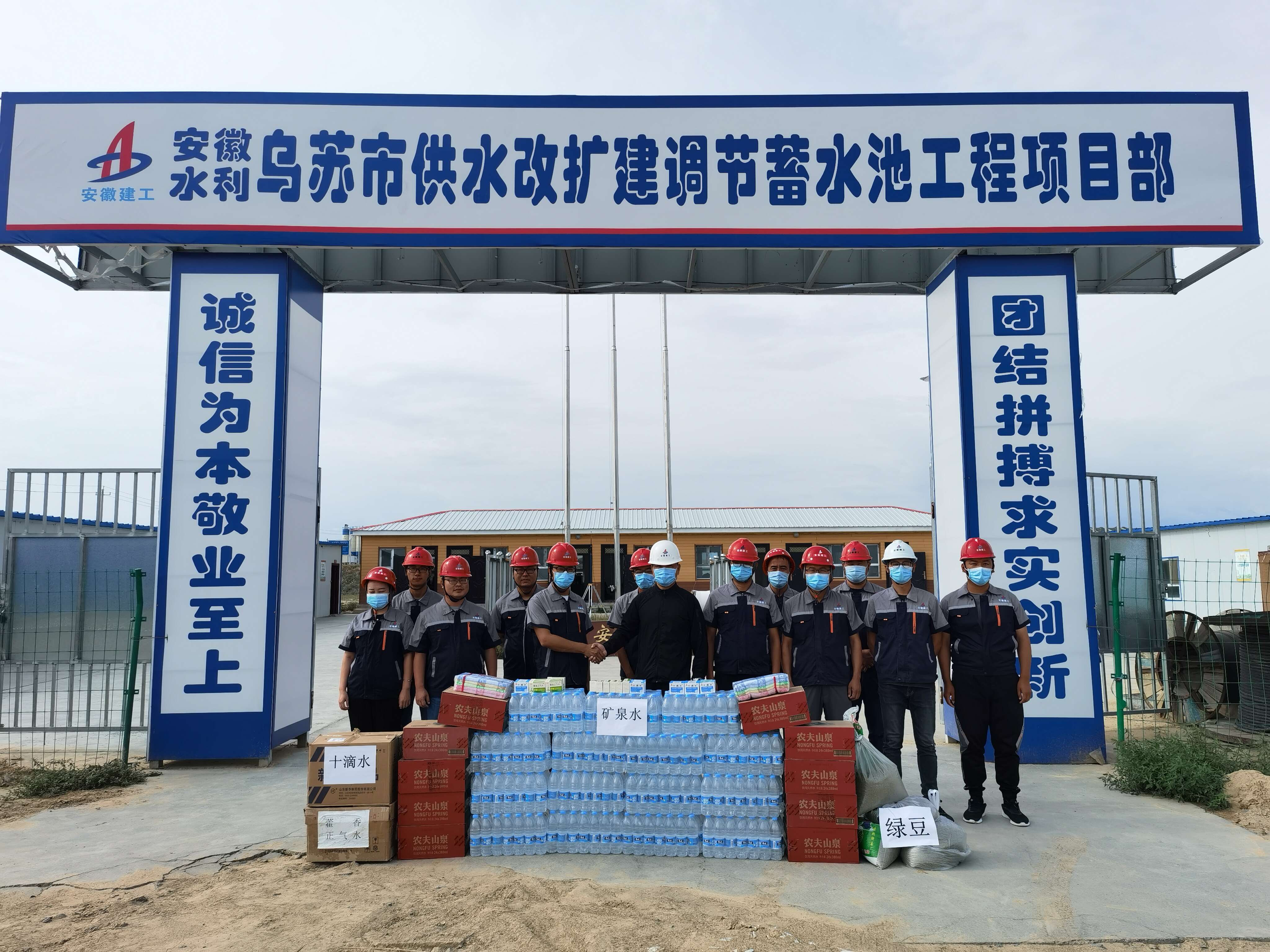 2021年7月14日上午,公司副總經理王軍赴烏蘇市供水改擴建調節蓄水池項目“送清涼”,將礦泉水、綠豆、冰糖、藿香正氣水、十滴水、毛巾、香皂等防暑降溫物品送到一線員工手中。