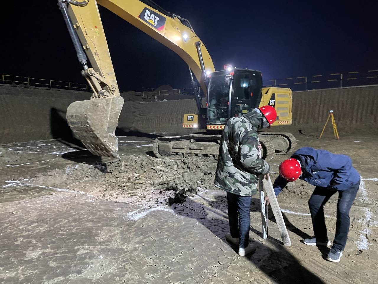 為滿足西動(dòng)力中心承臺(tái)澆筑要求,施工現(xiàn)場燈火通明,項(xiàng)目經(jīng)理徐明東帶領(lǐng)施工員正在認(rèn)真進(jìn)行西動(dòng)力中心承臺(tái)基礎(chǔ)測量復(fù)核工作。
