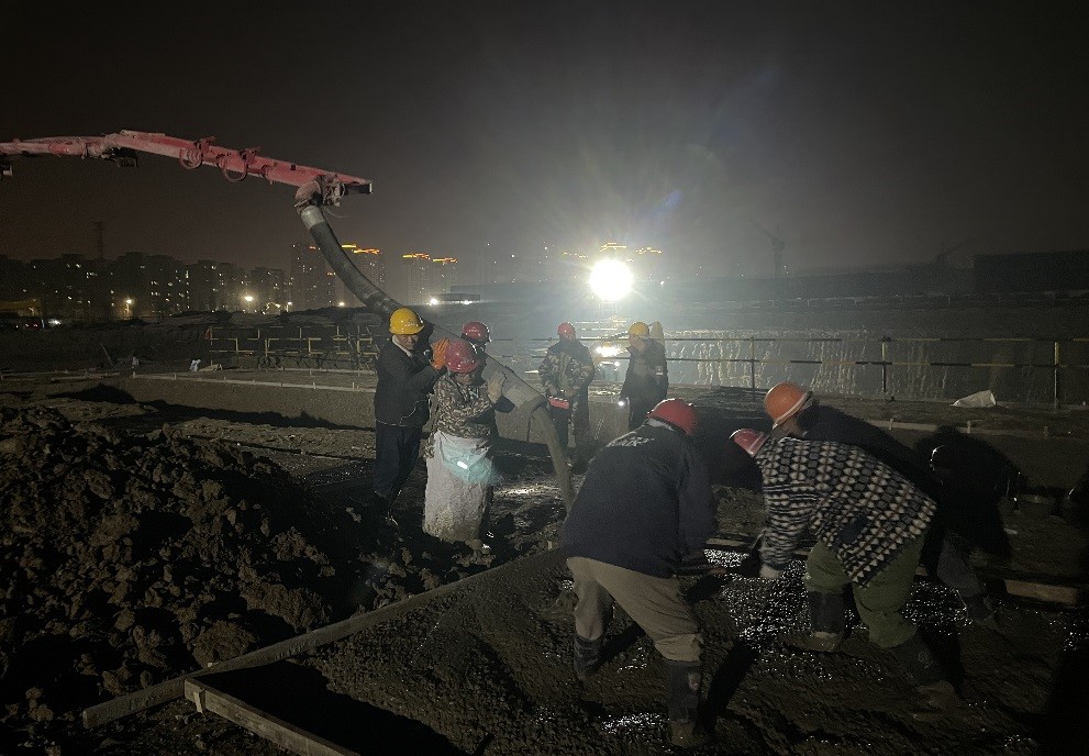 工人師傅們晚上加班加點(diǎn)進(jìn)行西動(dòng)力中心基礎(chǔ)墊層澆筑