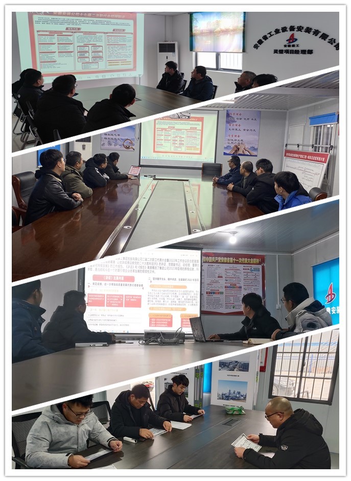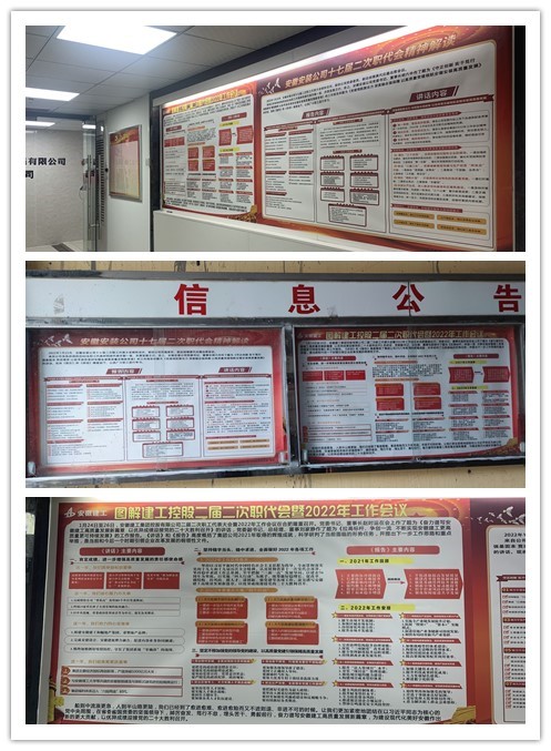 為統一思想,營造良好氛圍,分公司領導帶頭學,黨支部利用支委會、機關(項目部)專題學習會、班子理論學習會、黨員活動日以及下發會議精神圖解、張貼宣傳欄、深入基層一線宣講等多種形式,迅速掀起學習宣貫集團二屆二次職代會暨2022年工作會議和公司十七屆二次職代會精神的熱潮。