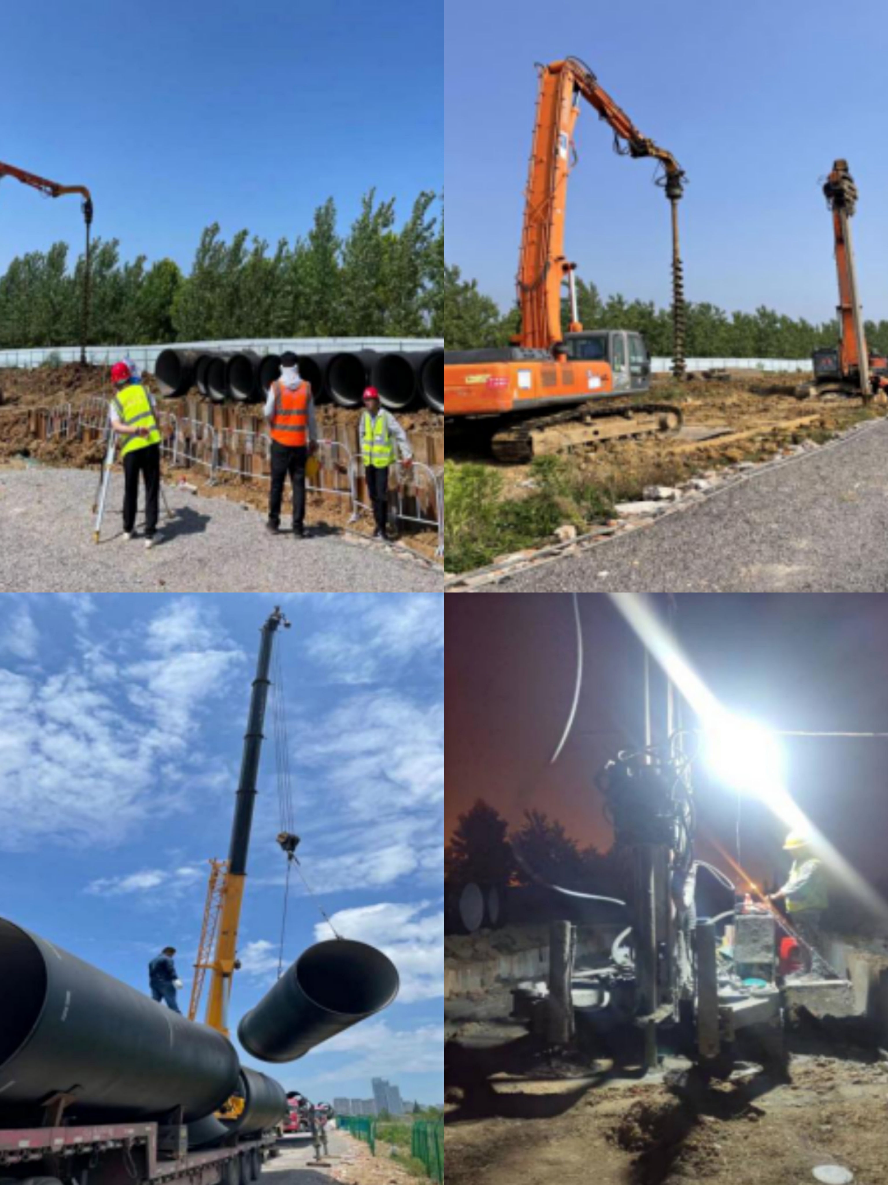 圖為市政分公司四水廠DN1800、DN1400供水管道遷建工程項目現場砂墊層夯實、測量;對球墨鑄鐵管進行吊裝;為搶施工進度夜間施工壓密注漿。