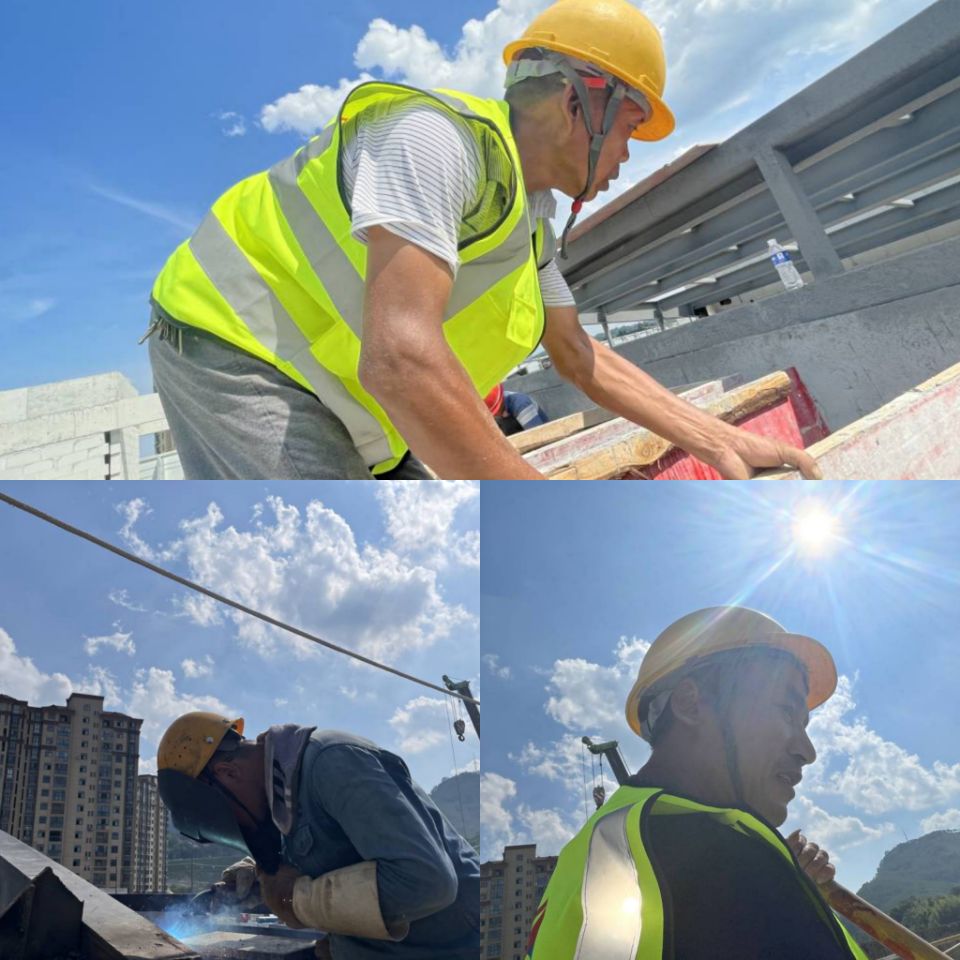 合肥分公司岳西恒泰城項目一線工人頂著38度高溫,揮汗如雨默默奉獻(xiàn);圖為模板安裝、焊接作業(yè)及混凝土澆筑施工。