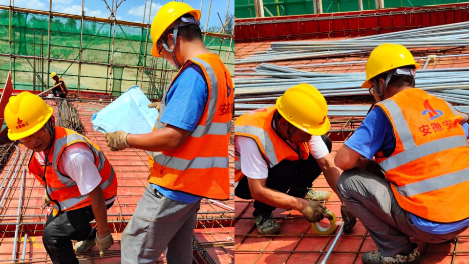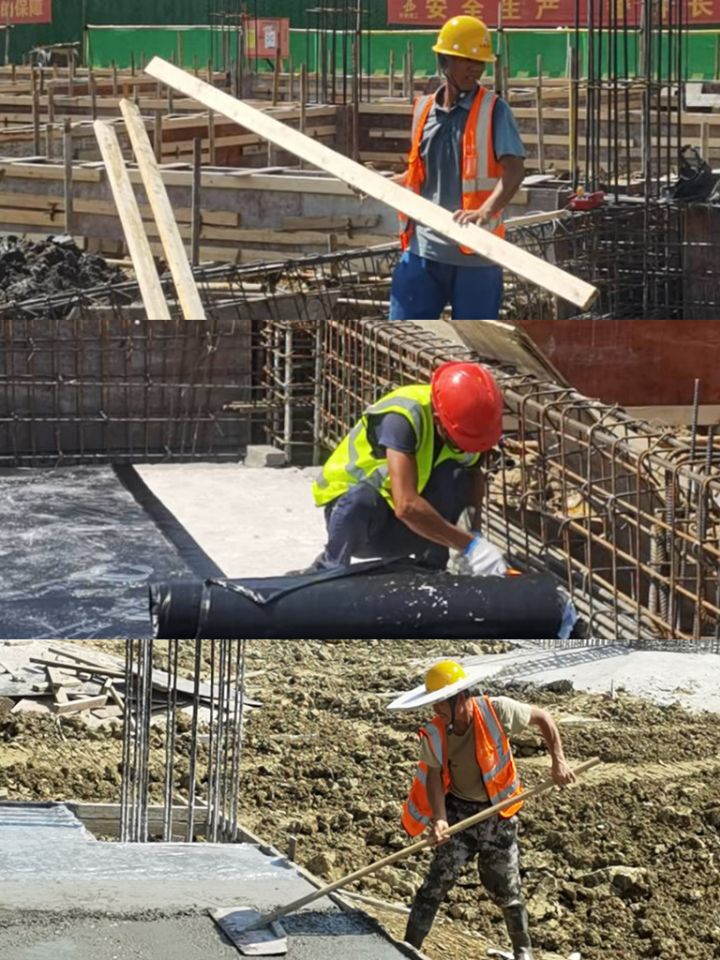 合肥分公司肥西安信立士項目一線工人在熱浪滾滾中堅守崗位;圖為木工支模、貼防水卷材及地坪抹平施工。