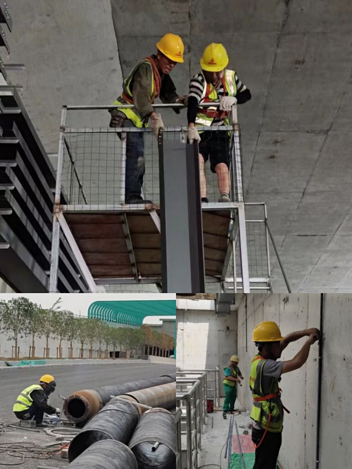 合肥分公司花園大道項目一線工人不遺余力苦干實干,汗水和膚色就是最好的見證;圖為隧道內(nèi)橋架安裝、管道預(yù)制焊接及雨水泵房電氣配管施工。