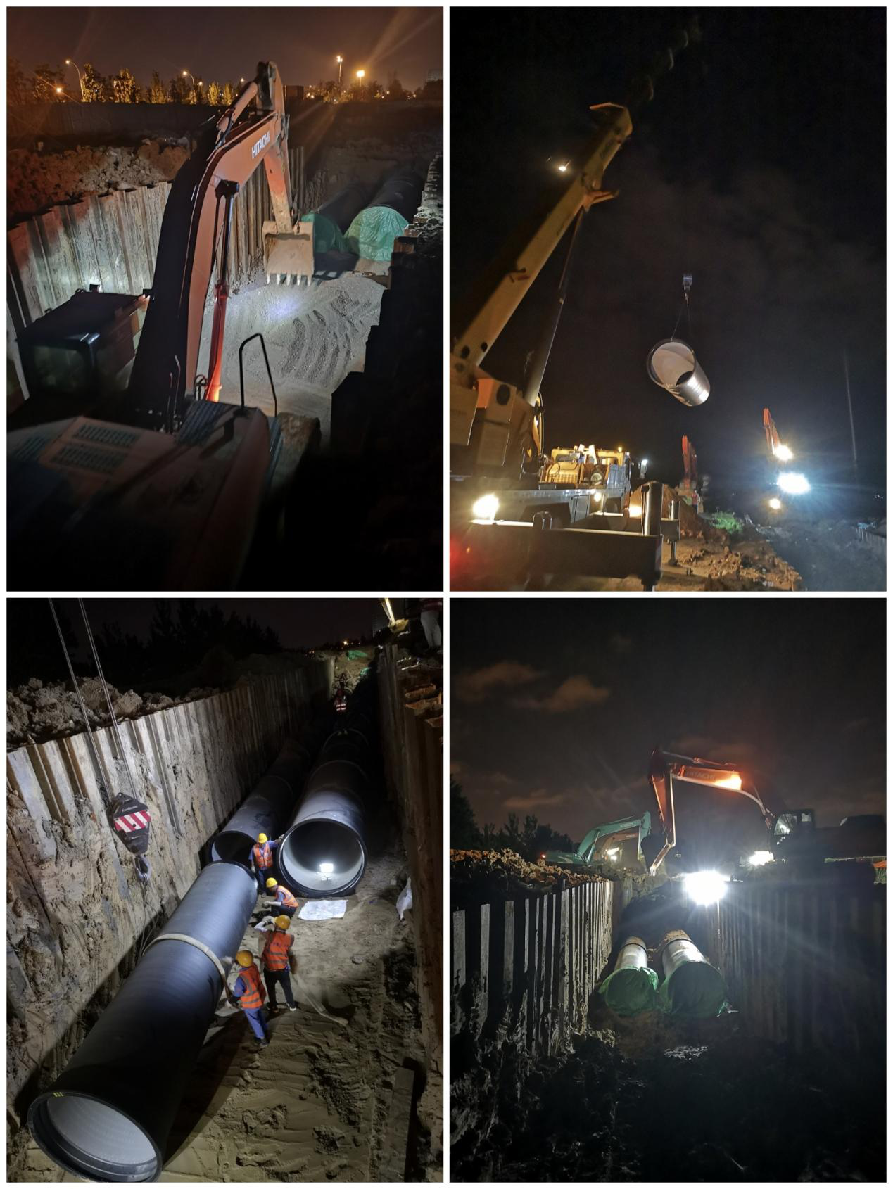 圖為市政分公司四水廠DN1800、DN1400供水管道遷建工程管網項目正在緊張施工。1.焊花綻放、夏季中最美的煙花,2名焊工,正在對DN1800鋼管與法蘭進行焊接(上圖)2. 50噸吊車正在對DN1800球墨鑄鐵管進行吊裝(右下圖);3. 槽底換填、鋪砂墊層(左下圖)