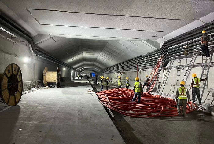 目前,項目下穿隧道東、西側(cè)1#2#配電房一次性送電成功,能夠提供隧道現(xiàn)場施工用電,東側(cè)雨水泵房和中間廢水泵房已完成施工任務,隧道里的橋架安裝、電纜敷設(shè)、消防水管安裝、照明燈具安裝及各附屬設(shè)施安裝建設(shè)也正在加速進行當中。