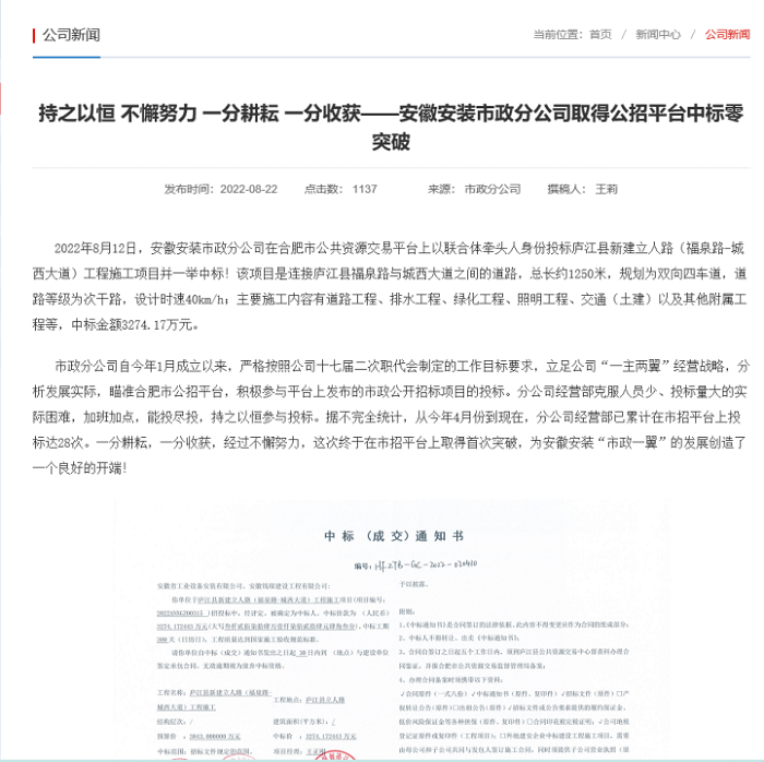 開拓市場取得突破。今年以來,分公司積極采取參與集團內部產業鏈專業分包競標和外部公招項目投標雙向并舉的方式拓展市場,打開經營局面,連續承接了蜀山區體育公園項目安裝工程等多個項目。同時積極參與合肥市公招平臺投標,8月份一舉中標廬江縣新建立人路(福泉路-城西大道)工程施工項目,中標金額3274.17萬元,取得公招投標零的突破。