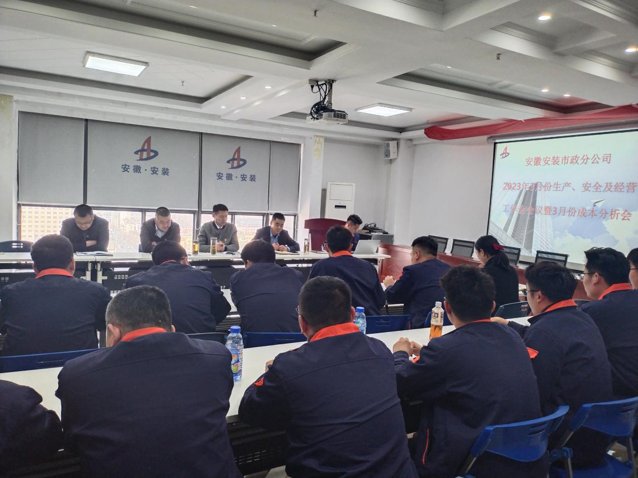 3月4日下午,市政分公司在公司十五樓職工之家組織召開分公司2023年3月份生產、安全及經營工作會議暨月份成本分析會,分公司領導班子成員、部門及項目部全體人員參會,會議由分公司副經理張漢軍主持。