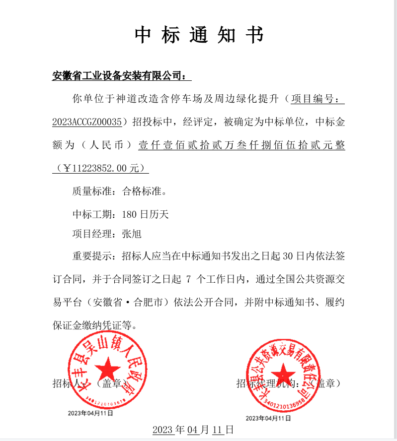 4月11日,安徽安裝市政分公司在合肥市公共資源交易平臺上投標長豐縣吳山鎮神道改造含停車場及周邊綠化提升項目并一舉中標,中標金額1122.38萬元。這次公招中標是分公司繼2022年8月12日廬江立人路項目中標后第二次在合肥市公招市場中標的市政類項目。