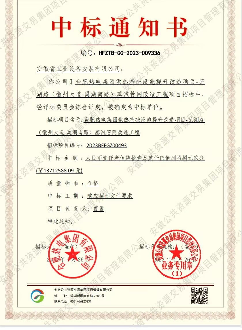近日,安徽安裝市政分公司收到安徽公共資源交易平臺發來的中標通知書,成功中標合肥熱電集團供熱基礎設施提升改造項目-蕪湖路(徽州大道-巢湖南路)蒸汽管網改造工程,中標金額1371.25萬元。