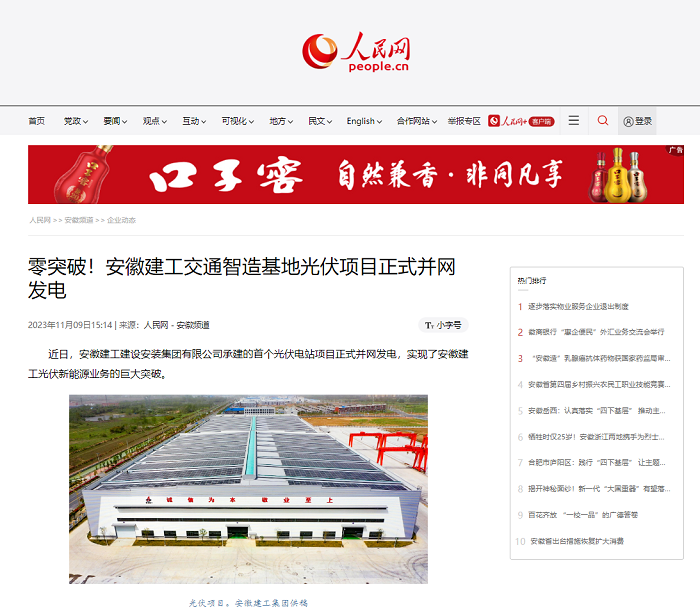 近日,人民網專題報道公司承建的首個光伏電站項目正式并網發電,實現了安徽建工光伏新能源業務的巨大突破。