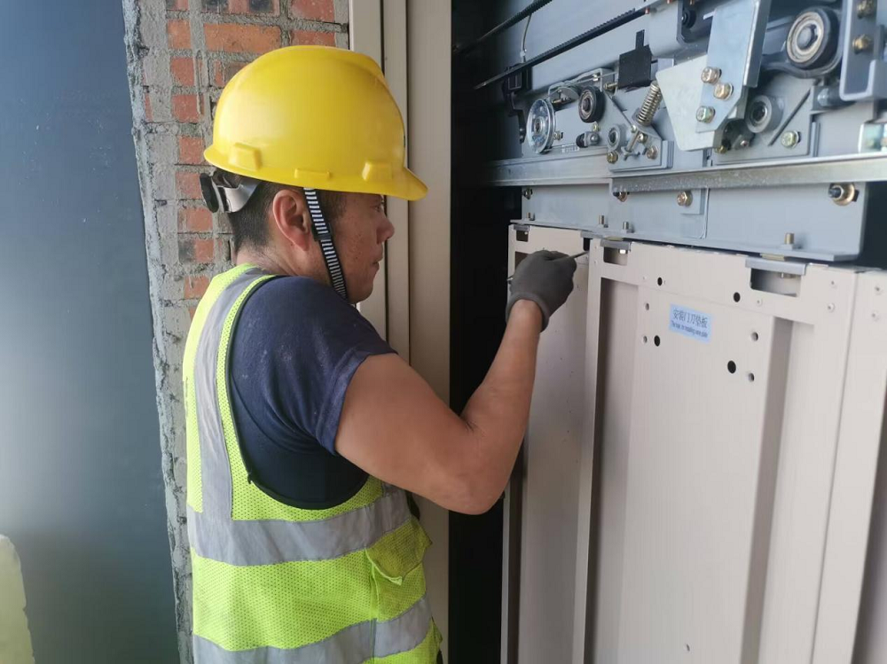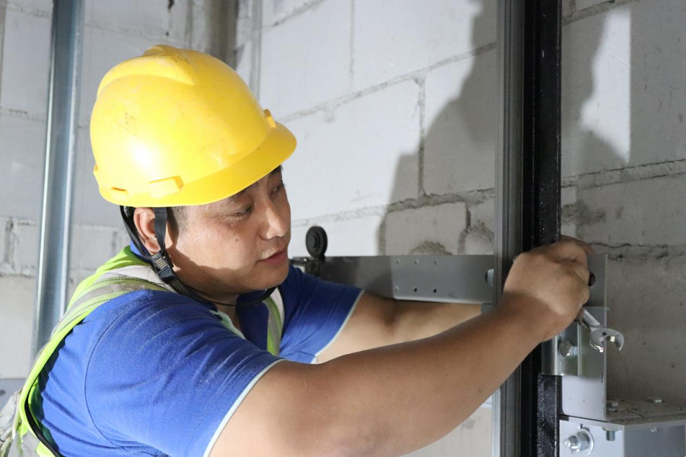 蚌埠傳感谷(寧波蚌埠微電子產(chǎn)業(yè)園一期)項目施工人員正在安裝電梯轎廂門