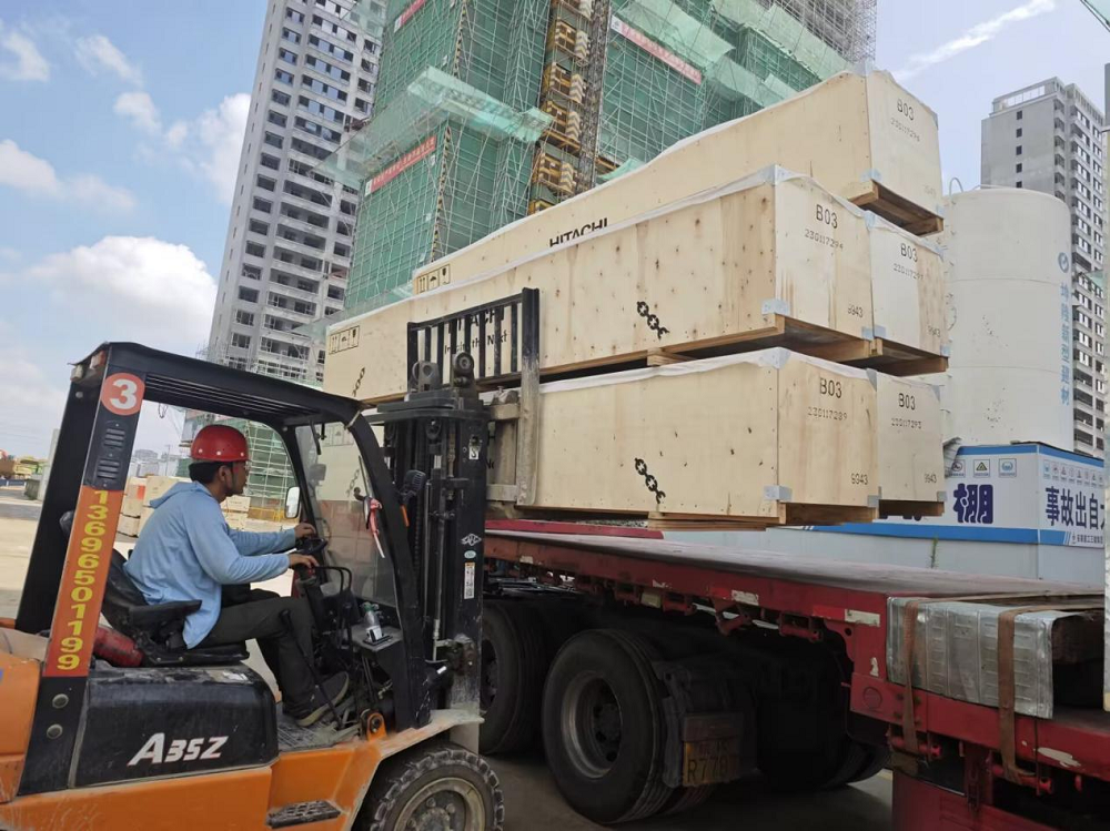 派河印象·杏語林溪項目施工人員正在給到場電梯卸貨