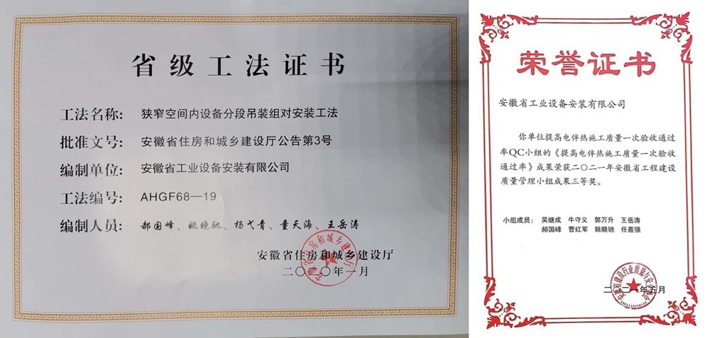 在繁忙的工作之余,姚曉馳對(duì)專業(yè)知識(shí)的探索與熱愛(ài)從未有片刻停歇。他仿若一位求知若渴的行者,積極主動(dòng)地在知識(shí)的海洋中破浪前行,持續(xù)拓寬并深化自身的知識(shí)體系。他參與研發(fā)的《狹窄空間內(nèi)設(shè)備分段吊裝組對(duì)安裝工法》成功榮獲安徽省住房和城鄉(xiāng)建設(shè)廳頒發(fā)的省級(jí)工法稱號(hào),《提高電伴熱施工質(zhì)量一次驗(yàn)收通過(guò)率》也榮獲了安徽省工程建設(shè)質(zhì)量管理小組成果三等獎(jiǎng)。
