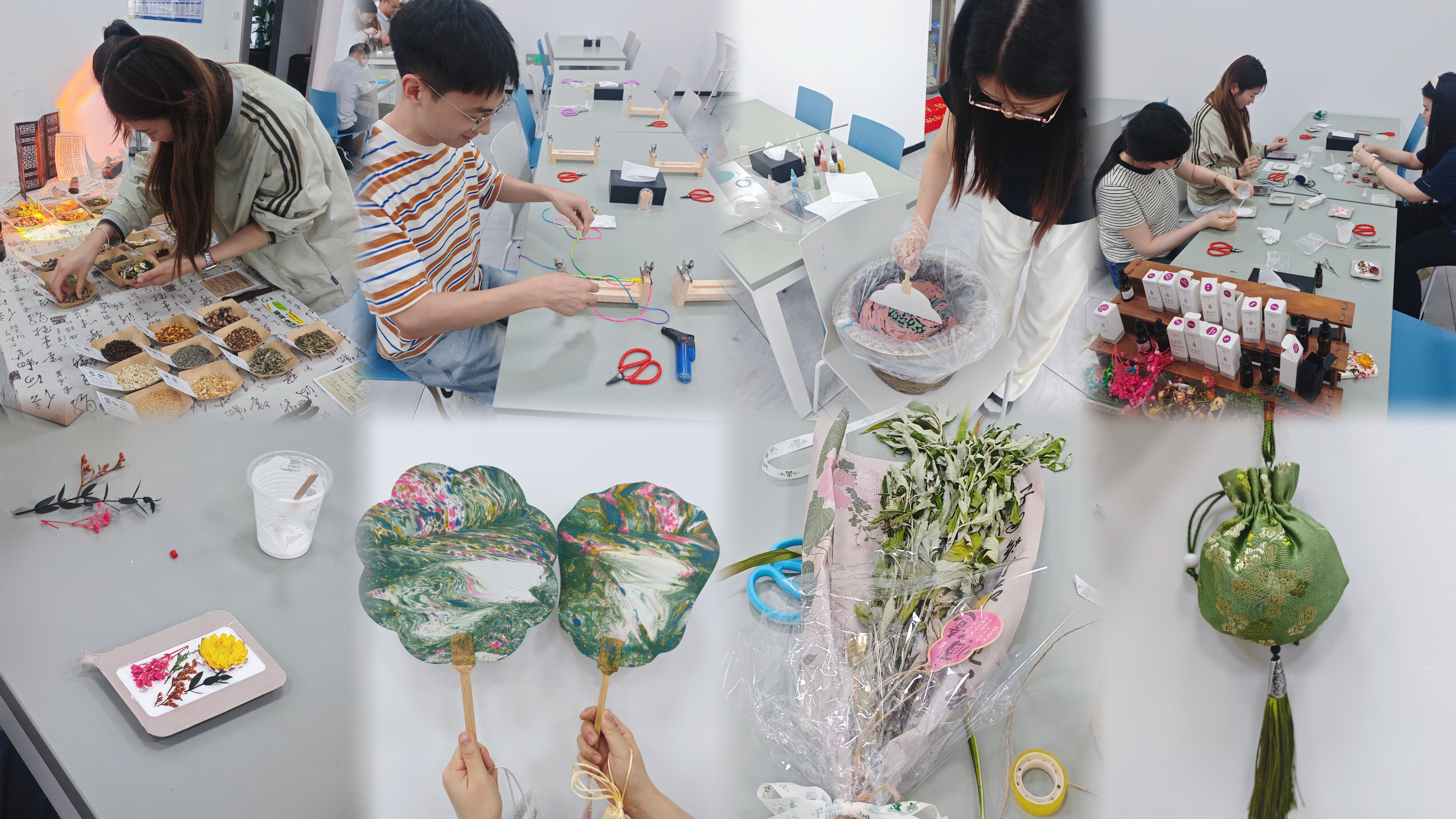 活動現(xiàn)場,五彩繩、香囊、艾草花束、漆扇、香牌等豐富多樣的手工項目精彩紛呈,吸引了眾多職工熱情參與。大家相互交流與合作,親手制作獨具特色的端午手工藝品,感受著傳統(tǒng)文化的深厚底蘊。