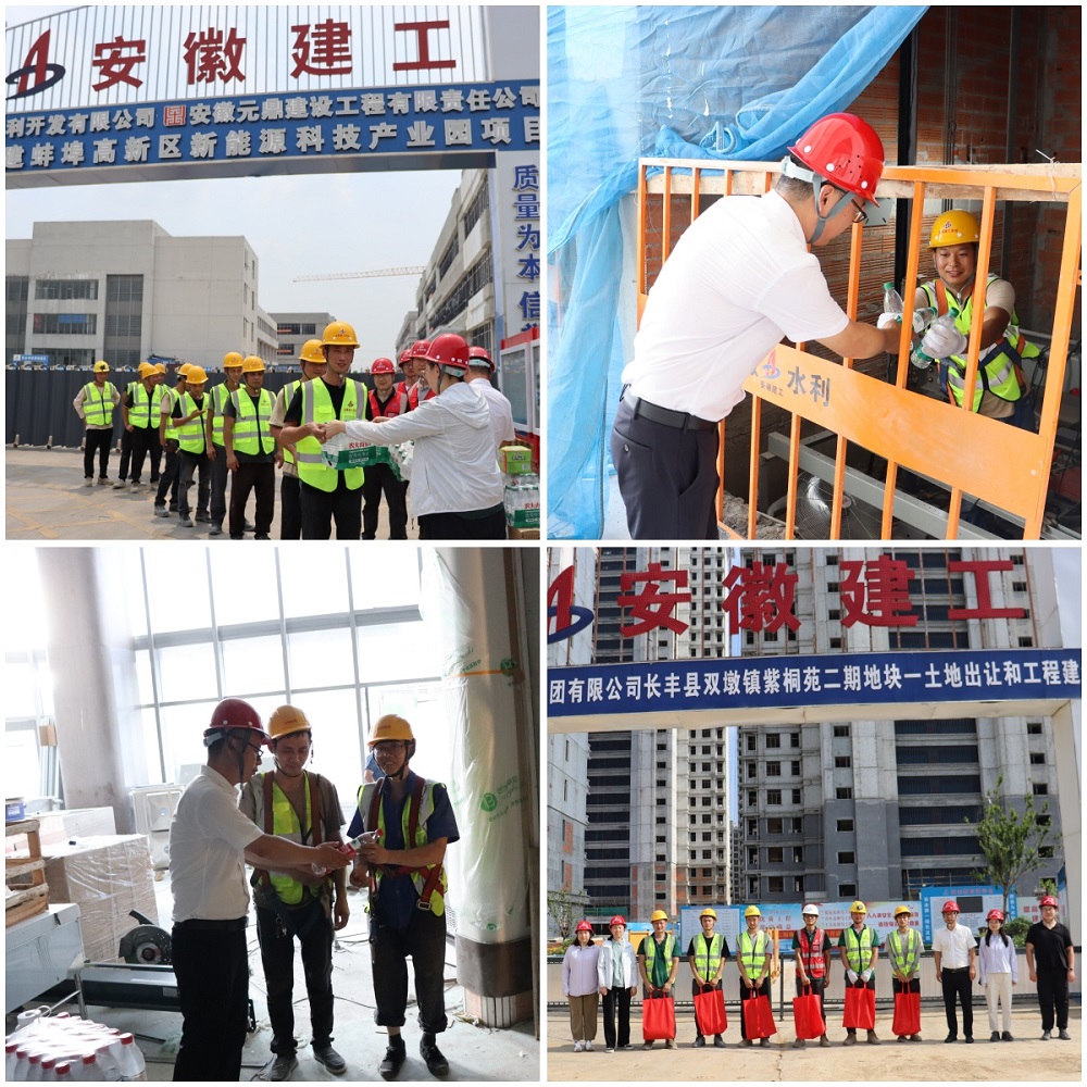 此次活動由電梯公司領導班子成員帶隊,先后深入蚌埠高新區新能源科技產業園EPC項目、長豐縣雙墩鎮紫桐苑項目、匯金商務中心S1#樓室內裝修設計施工項目、潭沖河家園E地塊EPC總承包項目等多個電梯安裝施工現場進行走訪慰問,感謝大家在高溫下堅守崗位,并將礦泉水、綠茶、人丹、藿香正氣水、風油精、毛巾等防暑降溫用品一一送到職工手中。每到一個項目,慰問組都詳細了解項目進展以及員工生產生活情況,認真傾聽一線員工的心聲,著重強調安全生產工作,叮囑項目部高溫天氣要做好防暑降溫措施,合理安排高溫工作時間,做好高溫下作業人員防護,時刻把安全生產牢記于心,全力保障員工的健康和安全。